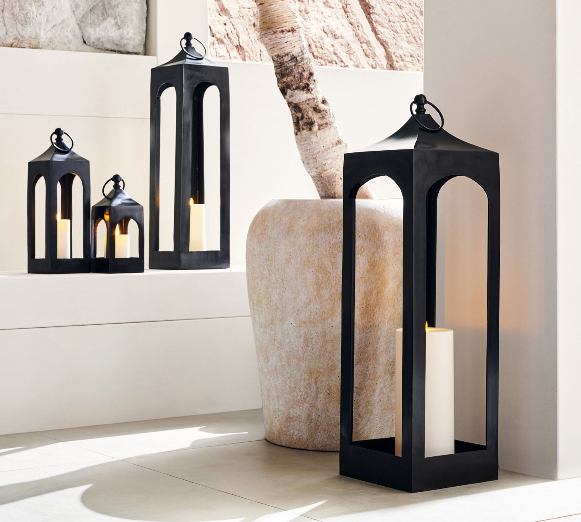 - Fireplace Filler: Not using your fireplace in summer? Fill it with two to three Caleb lanterns of varying heights, each holding oversized pillar candles.